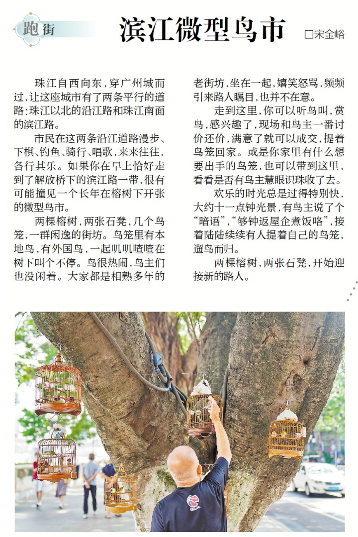 市民在这两条沿江道路漫步、下棋、钓鱼、骑行、唱歌,来来往往,各行其乐。如果你在早上恰好走到了解放桥下的滨江路一带,很有可能撞见一个长年在榕树下开张的微型鸟市。