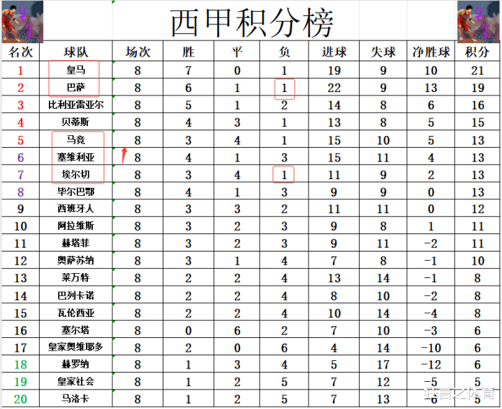 积分榜方面,随着巴萨惨败,升班马埃尔切也输了球,本赛季西甲就再没有不败球队,输球的巴萨还是差皇马2分,无力夺回榜首排在第2。比利亚雷亚尔差巴萨3分排在第3,贝蒂斯赢球后排名继续上升,他们差巴萨4分排在第4。马竞本有机会冲到第4,但是无力赢球的他们,尽管已经7轮不败,但是差贝蒂斯2分排在第5。击败巴萨的塞维利亚追上马竞,1个净胜球的劣势紧随其后排在第6。