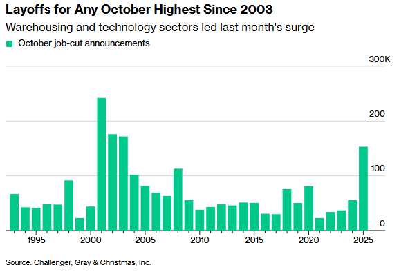 这一数据与美联储主席杰罗姆·鲍威尔近期关于“就业市场仅温和降温”的表态形成鲜明对比。大量裁员可能加剧市场对劳动力市场健康状况的担忧,尤其是在政府停摆导致官方数据缺位的背景下,经济学家不得不依赖私营部门数据(如ADP、Revelio Labs)进行分析。